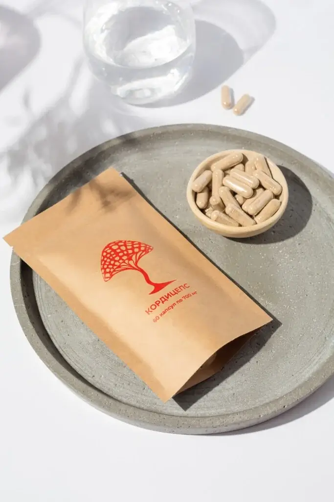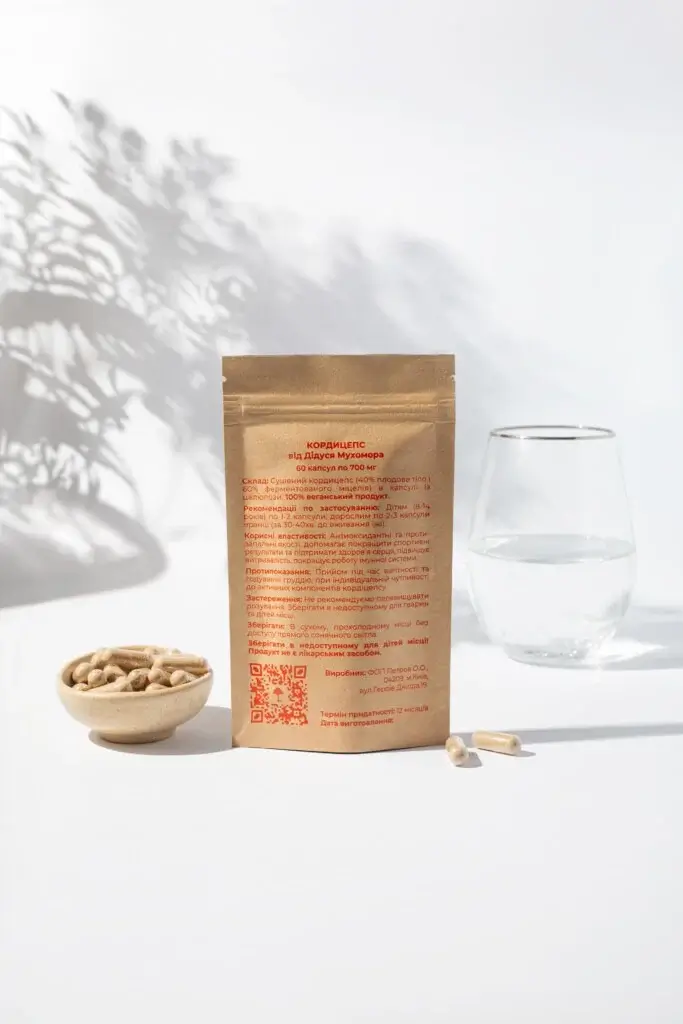 Майстерня “Дідусь Мухомор” створює якісний продукт із кордицепсу на власній фермі в Україні. У кожній капсулі — 700 мг меленого гриба з плодового тіла (верхня частина) та міцелію (основа).